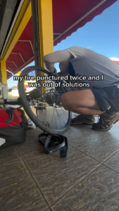 As Joel tried to figure out what to do about his bike, another villager arrived — Isa. After hearing what had happened, Isa sat down with him and began trying to revive the tyre.