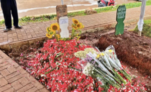 Fresh petals blanketed the still-damp soil. Jasmine flowers were carefully arranged into a heart shape, while several stalks of sunflowers stood in front of her wooden headstone — a quiet tribute to a child remembered for her bright personality.