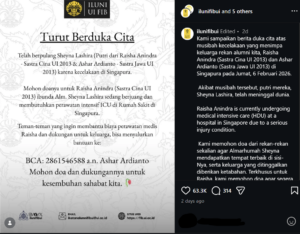 The University of Indonesia alumni association appealed for donations to Raisha’s husband’s account, sharing prayers for Raisha’s full recovery and strength for the family during this difficult time.
