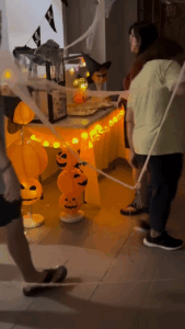 The decorations, which included orange lighting and playful warning signs, turned the space into a scene straight out of a Halloween movie.
