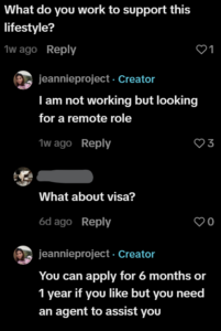 But the comments quickly turn practical. When asked how she funds her lifestyle, she replies that she’s not currently working and is looking for a remote job.