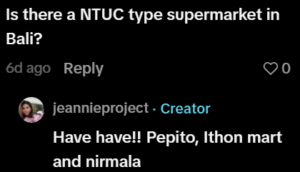In response to a commenter, she says, for groceries, there are supermarkets similar to Singapore’s NTUC FairPrice, naming places like Pepito and Nirmala.