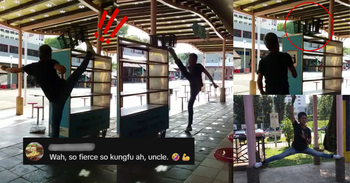 A video uploaded originally on 6 January this year has been making rounds on social media in the past week. The TikTok video, by user @sohbenghock, shows an uncle in Singapore doing karate kicks on a basket atop an unoccupied food cart. No bystanders can be observed in the video.
