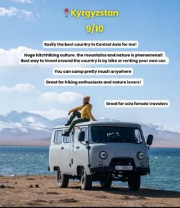 Among all the countries she visited, Kyrgyzstan and Pakistan stood out the most. She gave Kyrgyzstan a high rating because of its beautiful nature and popular hitchhiking culture. She explained that renting a car or bike is the best way to explore the mountains.