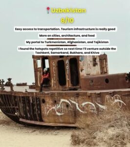 Uzbekistan offered beautiful blue buildings and efficient train systems in cities like Tashkent and Samarkand. After a few days, some places began to feel the same. She gave Afghanistan and Iran lower ratings than the other countries. She enjoyed the food in Afghanistan, but she felt worried about the lives of women there. These moments showed the reality of traveling in different regions.
