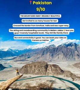 Travelers can camp freely in many green areas. The landscapes are perfect for hiking and outdoor adventures. Pakistan also impressed her with its friendly and welcoming people. On 17 March, she shared that many families invited her into their homes for tea. She felt very safe and welcome with the local people. Also, her trip from India into the next country was easy and went very well.