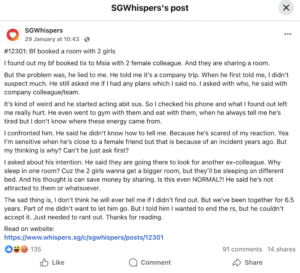 A young woman from Singapore recently had a personal experience that sparked a discussion on social media. The young woman, who had been in a relationship for 6.5 years, learned that her boyfriend had booked a trip to Malaysia with two female colleagues. At first, she didn’t pay much attention to the matter because he had described it as a work trip.