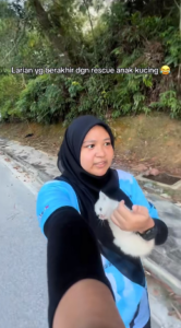 It remained quiet in her hands and made no attempt to move out. In a video clip, she grinned and told her that the morning run had become a rescue operation for a stray kitten.