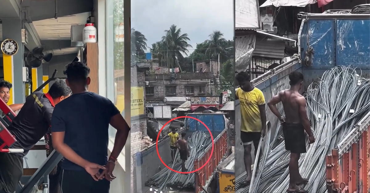 The internet is currently buzzing over a short video showing a surprising contrast between gym members and a manual laborer. The clip begins inside a modern gym where several men are seen using expensive machines and lifting weights.
