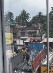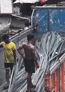 Just outside the gym, a young man is working on the back of a large truck. He is not a gym member, but a laborer tasked with moving heavy steel rods.