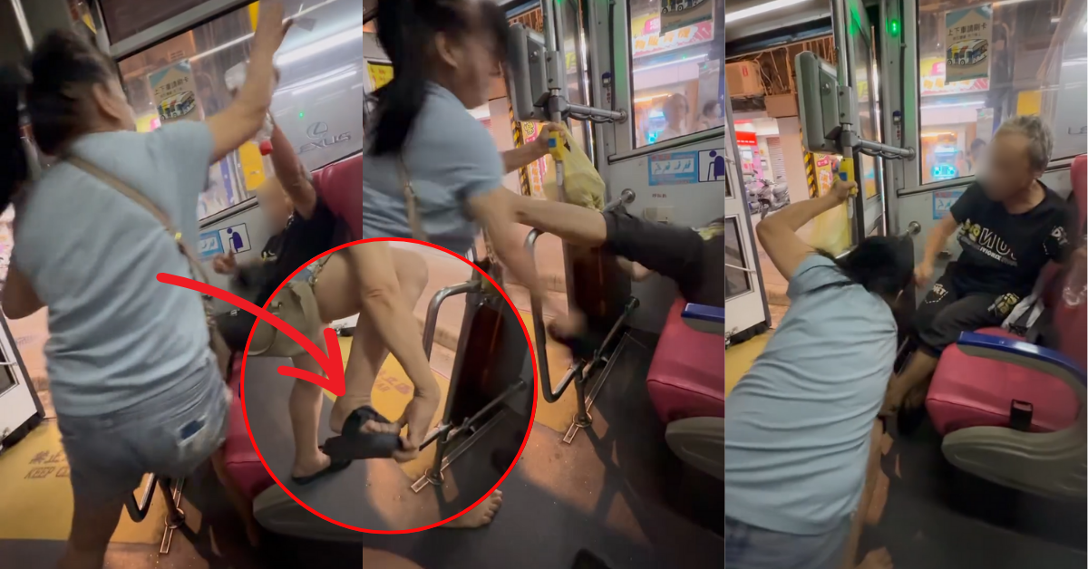 A 57-year-old woman, Wei, and an elderly man, Yang, were caught on camera swinging slippers and throwing kicks inside the bus.