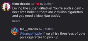 - Entire piles of cigarettes beside a bin “that had a million” of them