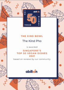 Its signature dish, The Kind Pho, was named among ‘Singapore’s Top 50 Vegan Dishes 2021’ and ‘Singapore’s Best 50 Vegan Dishes 2022’. The restaurant itself was voted sixth place in the ‘Top 50 Restaurants in the World 2023 on abillion, a global platform for a community of plant-based and sustainable living advocates, aiming to help 1 billion people to eat healthier and more sustainably.