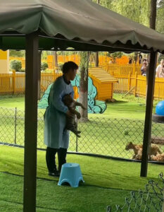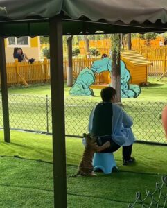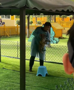 In the clip, the staff member was sitting quietly on a small plastic stool, keeping an eye on the cubs.