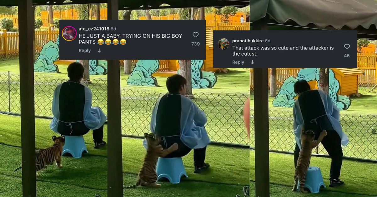 Many described the tiny tiger as just trying to act “grown up,” while others joked that the keeper accepted his “defeat” gracefully.