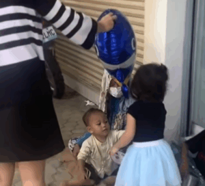 In the clip, the little child holds a bright balloon and approaches a father, a mother, and their child. Without any hesitation, the toddler hands the balloon over.