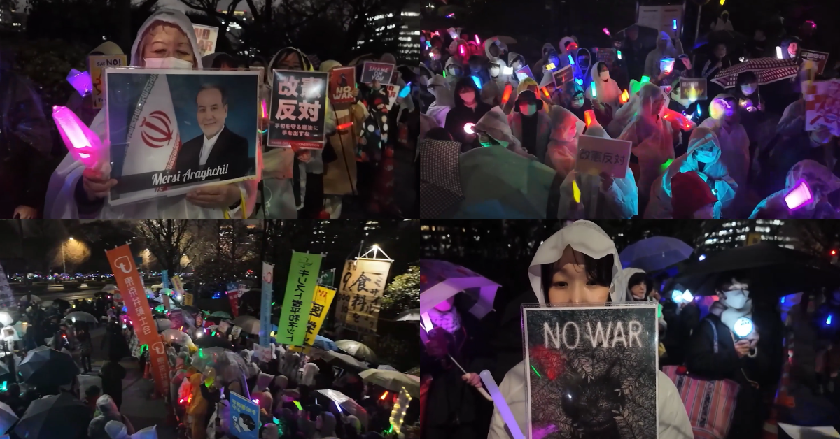 Footage shows protesters holding lights and banners reading ‘No war’, as criticism mounted over Tokyo’s security policies and its response to the widening Middle East conflict.