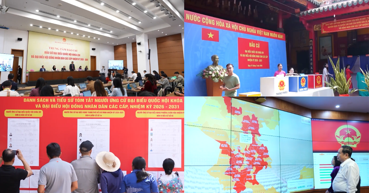 Footage shows voters casting ballots across Ho Chi Minh City, including at the Buddhist Quang Duc Monastery and the Ha Chuong Assembly Hall, a traditional community venue for ethnic Hoa residents.