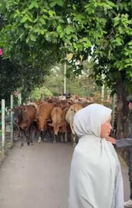 According to a video shared on social media, the cows maintained a respectful distance while the teenagers struck their best poses. The young women, wearing elegant hijabs and flowing dresses, stood confidently in the middle of the dusty road. Onlookers were truly amazed to see how calm the animals remained despite the bright colors and the loud excitement of the group. It appeared as though the herd was waiting for a specific cue to move forward again. This rare interaction between nature and tradition captured the hearts of many viewers online who appreciate the peaceful village atmosphere.