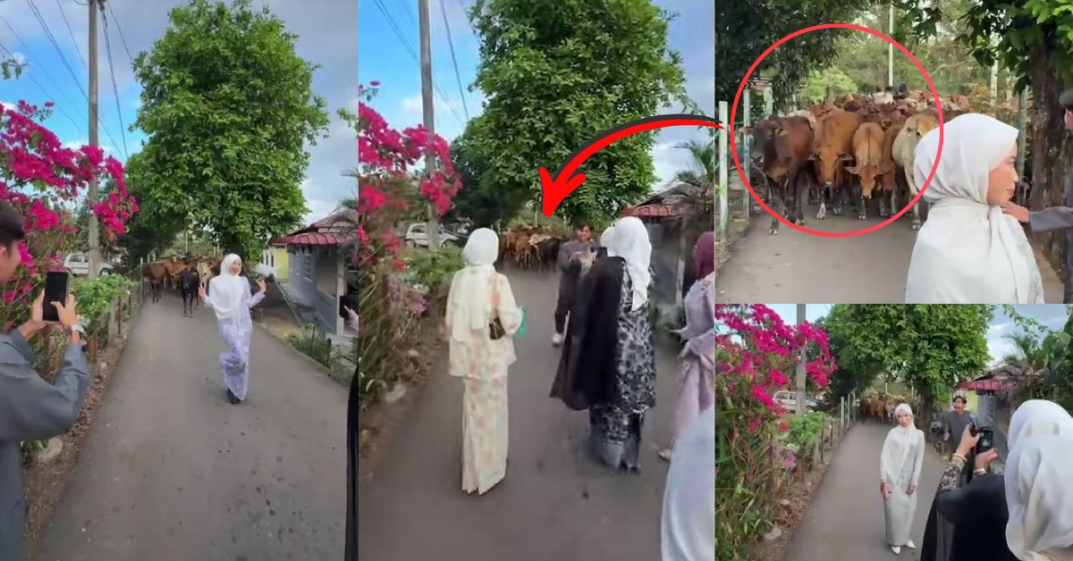 Social media is full of a very funny and interesting video. The video shows the happy feeling of the Raya festival. In this video, a few teens were dressed in baju raya and taking pictures on a quiet road. Some cows were walking behind them at a slow pace. Then, in a surprising moment, the cows stopped and just waited. They stayed calm and did not move quickly or disturb anyone.