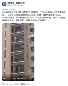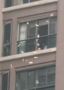 The incident reportedly took place on Friday morning at a housing complex in the Longhu District. Witnesses said the woman appeared on her balcony and began tearing banknotes before throwing them into the air. The notes were Hong Kong dollars, mainly in large denominations.