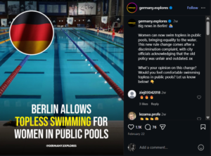 On examination of the case, the Berlin Senate of Justice, Diversity and Anti-Discrimination took her side. Authorities indicated that the old regulation discriminated people on the basis of gender. Due to that, the city concluded that the policy regarding the swimming pools had to be revised.