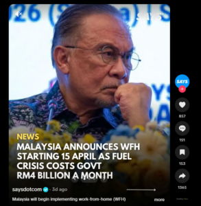 Malaysian Prime Minister Anwar Ibrahim announced in an address to the nation that work from home (WFH) will be introduced for employees of the public sector and government-linked companies (GLCs) from 15 April. However, this decision is not just a change in working methods, but part of dealing with a larger crisis.