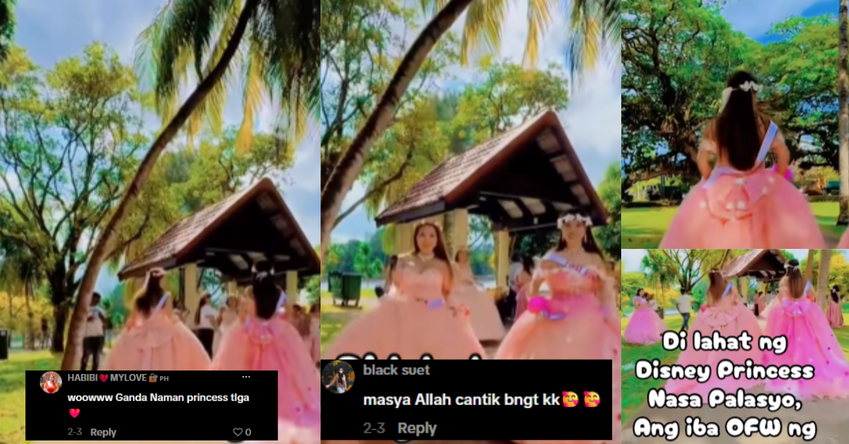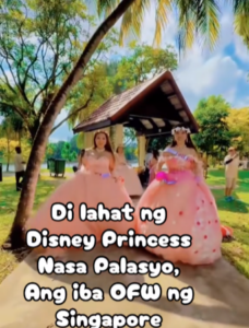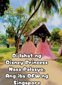 A short video filmed in a sunny park in Singapore has captured strong attention online. In the clip, several women wear bright pink ball gowns that look like Disney princess dresses. They are strolling gracefully in a row of high palm trees and smiling at the camera. The screen is written as, “Di lahat ng Disney Princess nasa palasyo, ang iba OFW ng Singapore.”