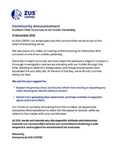 ZUS Coffee also urged the public to respect the barista’s privacy, refrain from sharing videos showing her face, and avoid spreading false claims online: