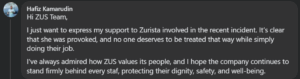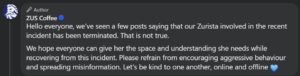 “Our Zurista is currently recovering from this incident, we appreciate everyone’s kind assistance to allow her the space to recover, while we attend to the matter with care and fairness.”